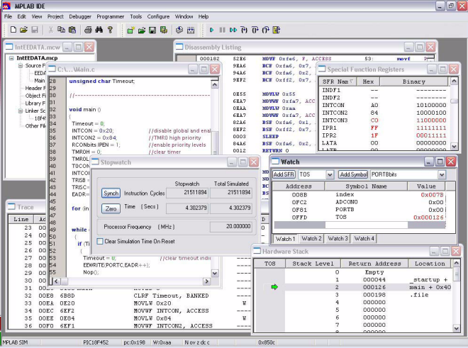 MPLAB Integrated Development Environment (IDE) is a free, integrated toolset for the development of embedded applications employing Microchip's PIC® and dsPIC® microcontrollers. MPLAB IDE runs as a 32-bit application on MS Windows®, is easy to use and includes a host of free software components for fast application development and super-charged debugging. MPLAB IDE also serves as a single, unified graphical user interface for additional Microchip and third party software and hardware development tools. Moving between tools is a snap, and upgrading from the free software simulator to hardware debug and programming tools is done in a flash because MPLAB IDE has the same user interface for all tools. | |